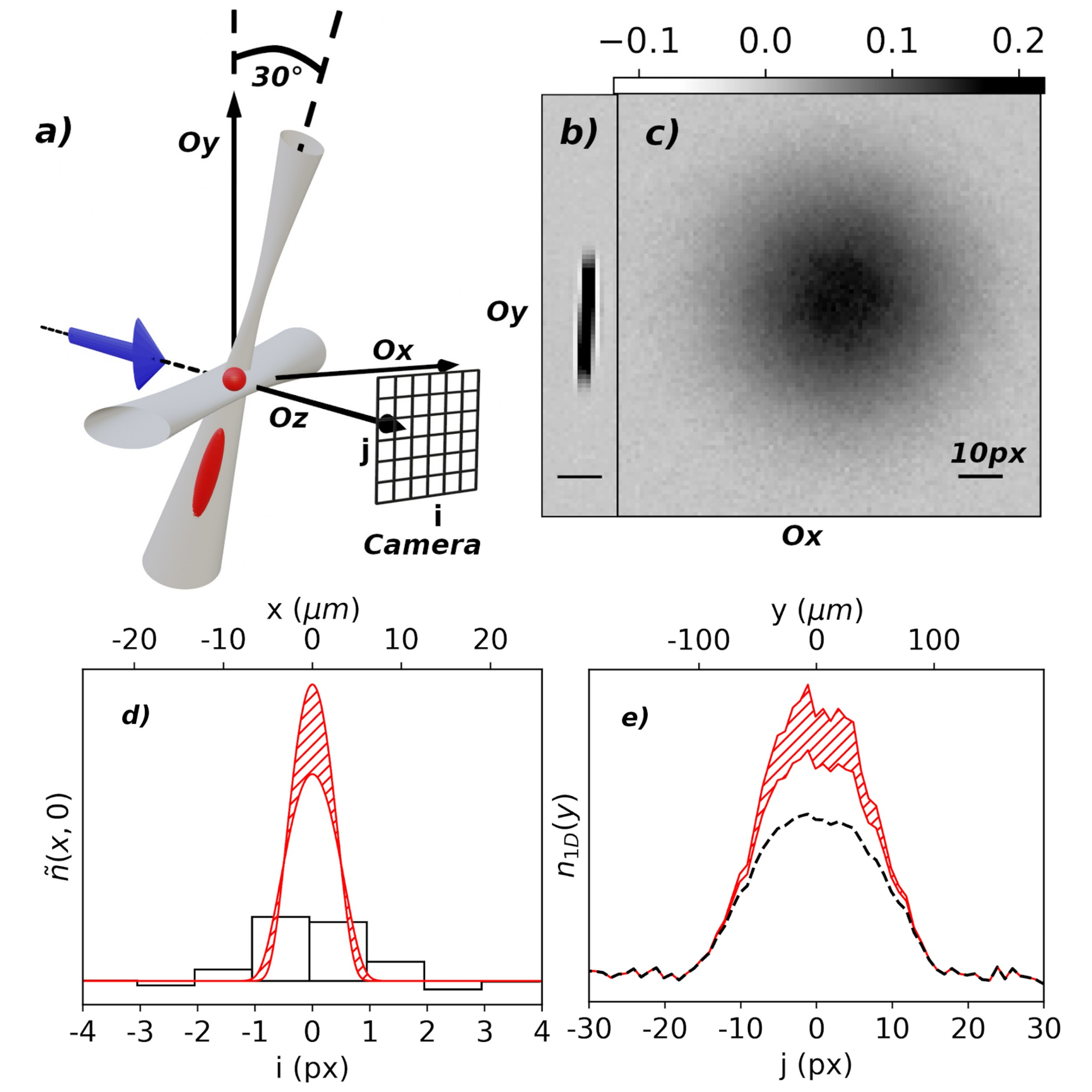 To execute this method, we take advantage of the fact that, for a given total number of atoms, a smaller and denser cloud scatters less photons when the gas is optically thick. The method relies on making an ansatz on the cloud shape along the unresolved dimension(s), and on providing an additional information such as the total number of atoms.